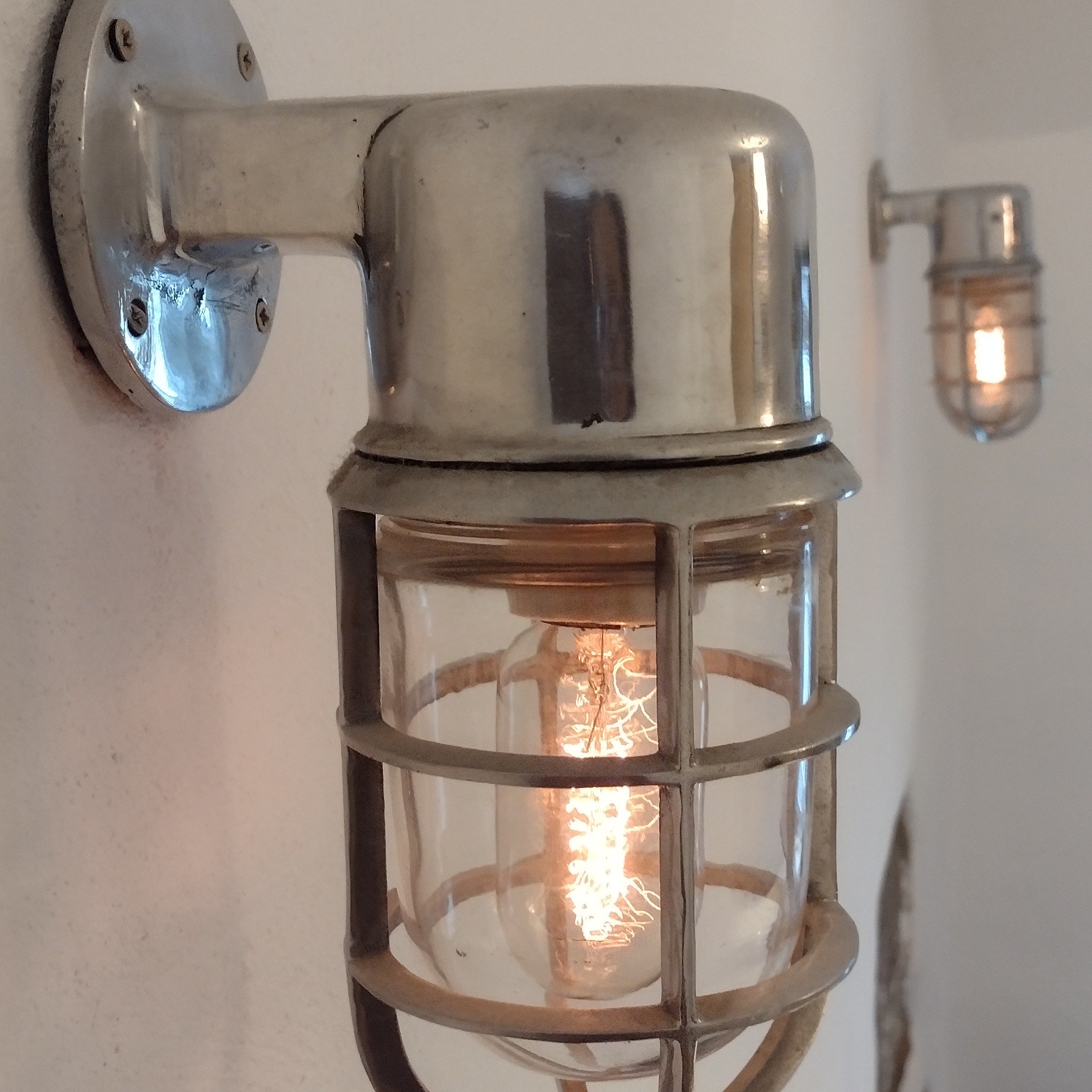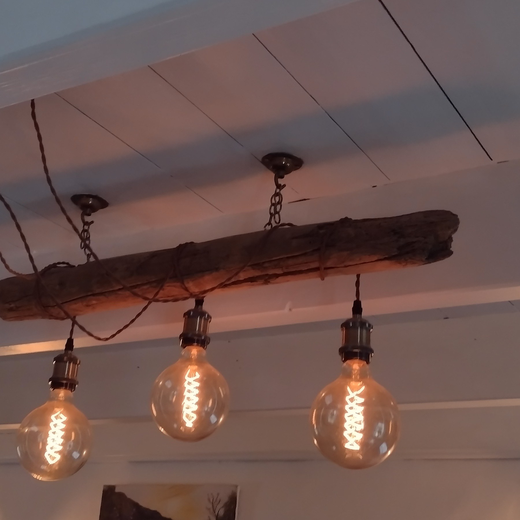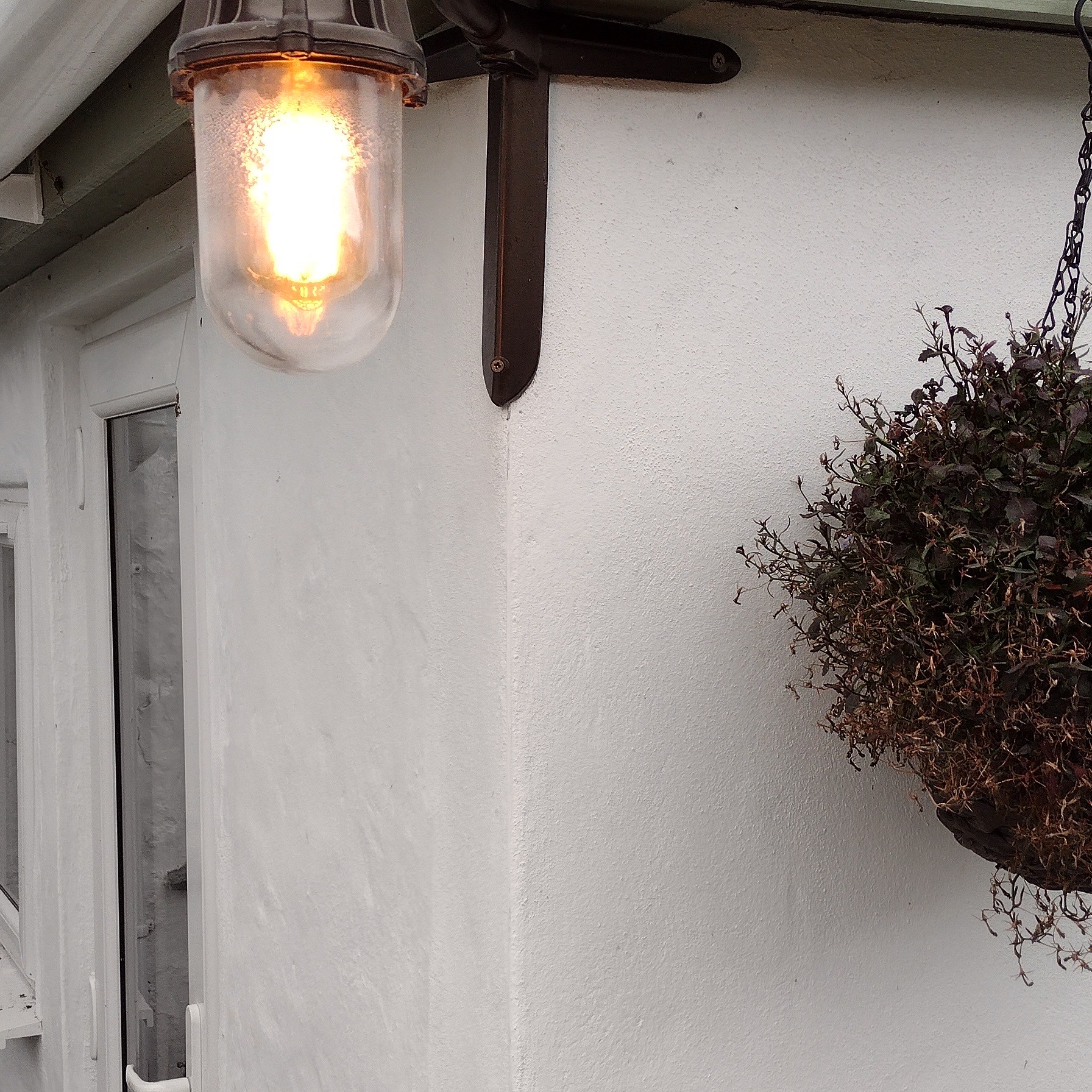 Recent renovation in Heamoor Penzance. Bespoke lighting including driftwood centerpiece lighting, vintage ship’s wall lighting, contempory modern spotlight, outdoor corner swan neck 1960’s model.