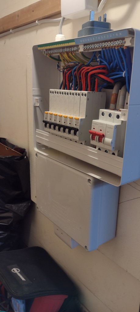 Switch cable had been damaged beyond repair, and the dwelling had been recently decorated so installed wireless light switch. It works from kinetic energy from switch to receiver at light fitting. Wireless switches are still in their relatively early stages and off the shelf at your local wholesaler they will generally be like a paddle switch – which are quite large and not in keeping with normal sized light switches around the home. Searched online and found a manufacturer from Italy who make wireless grid switches, the grid module clips into a metal grid plate then a front plate is fitted to the grid and hey presto! looks like any other switch 😃. At the light fitting the pendant part needs to be big enough to accommodate the wireless receiver. In this case the clients and I went to the nearest lighting wholesaler with the receiver and tried fitting the receiver in various ones until we found one that fit and the client was happy with the light fitting. I also recommended one with a metal housing, in this case chrome, reason being that metal is conductive so more prone to transmitting the signal whereas plastic is an insulator and may block the signal. The client was very happy with the outcome and so was I – a first for me and sure in the future there will be many more, especially in places with exposed stonework, they even do a dimmer version! Hope this helps anyone who is looking for a similar solution, feel free to get in touch if you need any help